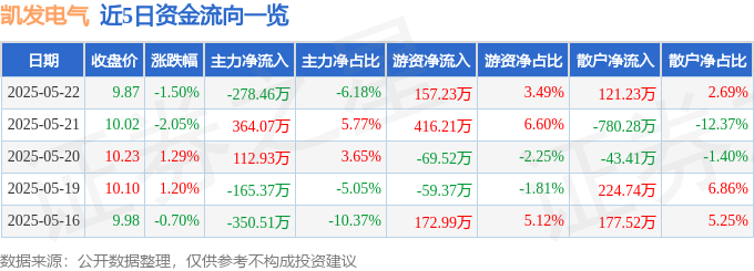 股票行情快报:凯发电气(300407)5月22日主力资金净卖